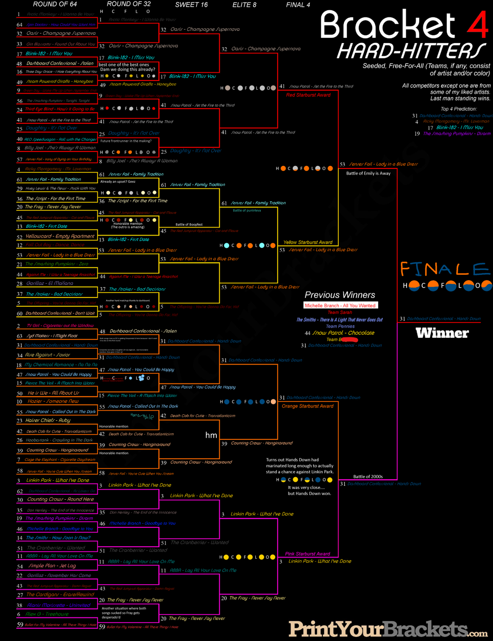I sometimes like to 'discover music' by taking songs I haven't listened to from my favorite Spotify artists and pitting them against each other in a tournament bracket. Now you can do the same, with different categories for top artists and top tracks! You can also make a bracket for one artist only, or make a manual bracket by inputting songs!